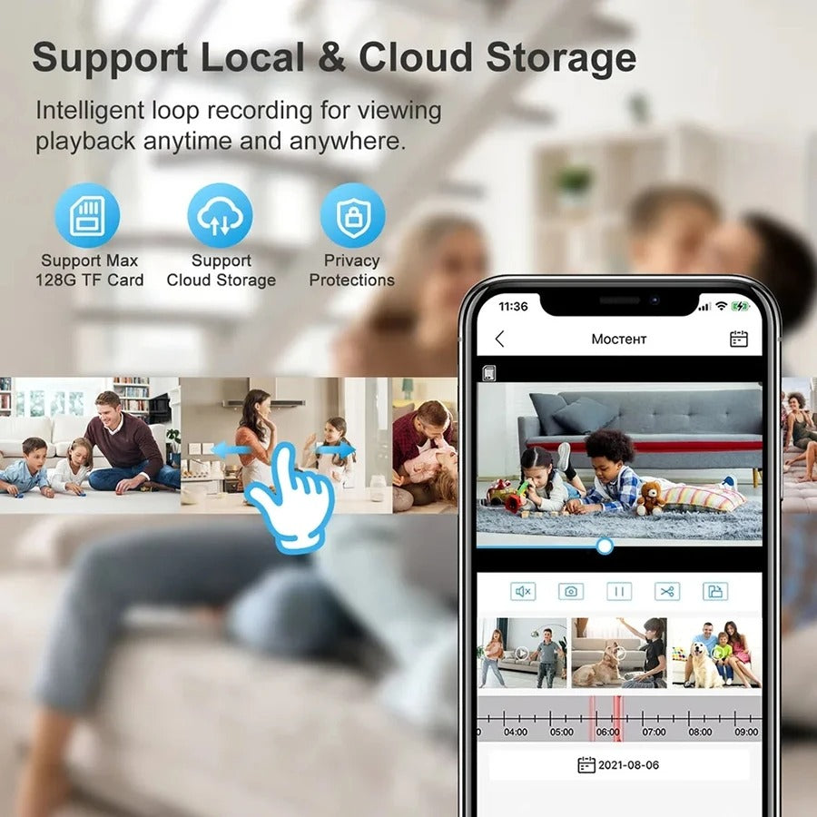 Enjoy 360° panoramic viewing with remote pan, tilt, and digital zoom control via your smartphone. Monitor large areas with ease—zoom in for close-ups or pan around the room for a complete view, all from anywhere in the world. 🌍📱