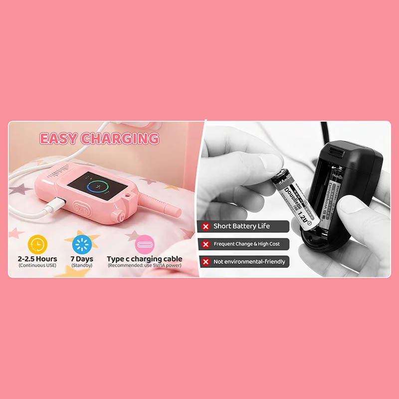 This intercom features a colorful cartoon look that instantly captures children’s attention while its lightweight, child-friendly design fits comfortably in small hands. Easy buttons and a simple interface ensure kids can use it independently without frustration.